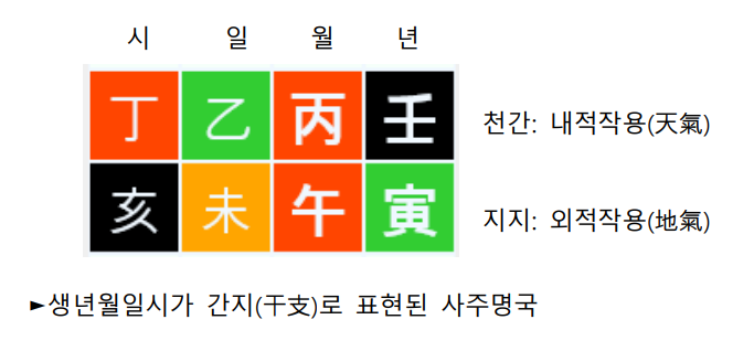 사주팔자를 기본 구조로 하는 명리(命理)는 태어난 년월일시(年月日時)의 간지(干支)를 가지고 일간인