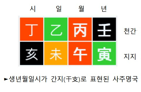 아래 도표에서 사주팔자 여덟 글자 중에 나를 상징하는 것은 일간 을목(乙木)입니다.