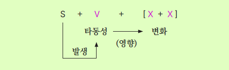 위 도표를 보면 주어와 동사는 공통적인 요소가 되고, X+X부분이 가변적인 부분이 되어 상황에 따라 다양하게 변화하고 있음을 알 수가 있다. 이와 같이 X+X부분이 각기 다른 변화를 갖는 것은 바로 V가 X+X에게 동작으로서 주는 영향이 제각기 다르기 때문이다. 즉, 동사는 자동성(自動性)과 타동성(他動性)이라는 성질을 가지고 있는데 이것이 X+X 라는 다양한 변화를 일으키는 원인이 되는 것이다.