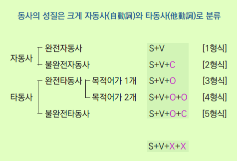 동사의 성질을 크게 분류하면 자동사와 타동사로 나뉜다. 또한 이것은 완전동사(完全動詞)와 불완전동사(不完全動詞)로 나뉘는데, 이것을 분류하고 번호를 매기면 곧 문장의 다섯 가지 형식이 된다. 물론 모든 영어문장이 다섯 가지 형식으로만 분류되는 것은 아니다. 그러나 포괄적으로 볼 때 문장을 다섯 가지로 분류하는 방법이 학습하는데 있어서 복잡하지 않아 좋다. 좀더 세분화된 분류는 어느 정도 학습을 한 후에 참고적으로 보는 것이 좋다.