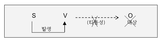 자동사란 주어가 실행한 동작이 다른 대상(O)에게 영향을 주지 않는 동사이다. 당연히 대상을 가질 필요도 없다. 대상이란 문법적 용어로 목적어(O)를 의미한다.