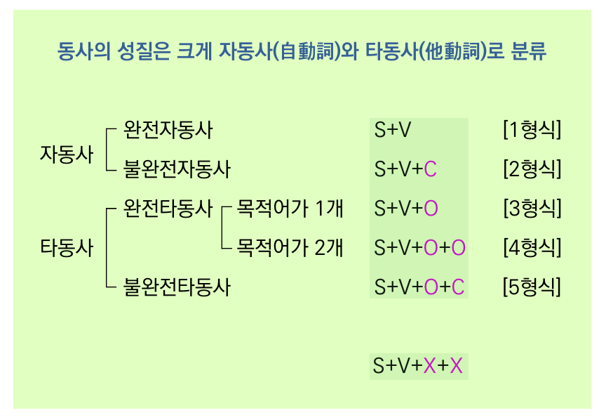 ◆ 동사의 성질을 다섯 가지 유형으로 정리를 하면 다음과 같다.