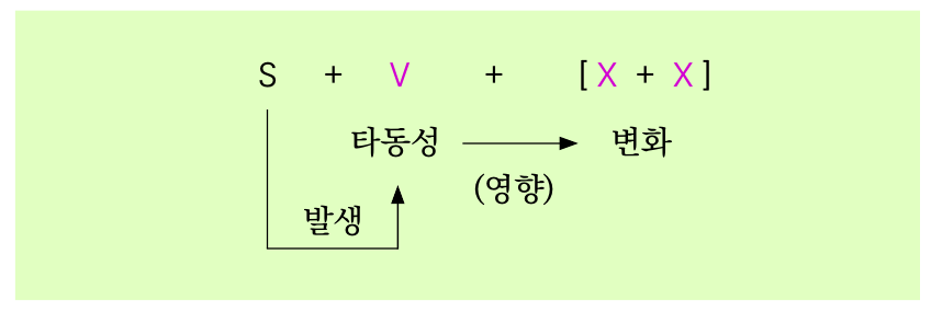 주어(S)가 실행한 동작(V)이 만들어내는 대상(O)의 변화는 동작의 성질에 따라 변할 수 있는 가변적인 것이므로 [X + X]로 표현한다. 영어문장의 생성원리를 이해하는 첫 걸음은 대상(O)에게 다양한 형태의 영향을 주는 [동사의 성질]을 이해하는 것이다.