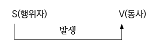 ‘S가 V를 실행하여 동작(상태)이 발생하다’라는 것을 의미한다. V는 동작의 발생(사실), 또는 기정사실로서의 미래(Future as Fact)를 의미한다고 정의를 내릴 수 있다. 위 도표를 보면 행위자와 동사 사이에는 시간적 제약을 주는 장애물(예를 들어 to나 조동사)이 아무것도 없으며 행위자와 동사가 바로 연결이 되어 있다. 이 경우 동사는 [발생]을 의미한다.