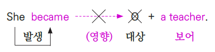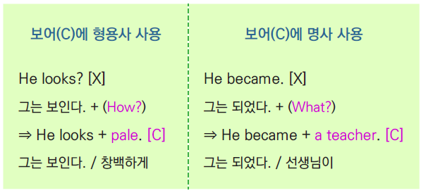 문장을 보면 1형식 문형과 달리 자동사만으로는 그 의미를 제대로 전달하지 못해 불완전한 모습을 보인다. 이런 경우 보어(C)로 그 의미를 보충하여 완전한 문장을 만들게 된다. 보충관계이므로 주어와 보어는 동격관계가 된다(S=C). 이렇게 자동사만으로는 문장의 의미를 완전하게 만들지 못하는 동사를 불완전자동사라 한다. 보어에는 명사류와 형용사류가 쓰인다.