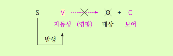 이렇게 주어가 실행한 동사만으로도 의미를 충분히 전달할 수 있는 경우 이 동사가 가지는 성질을 완전자동사라고 한다. 주어가 실행한 동사는 어떤 대상에게 영향을 줄 목적으로 실행되는 동작이 아니다. 그러므로 대상(O)이 필요가 없다. 이 문형을 1형식 문장이라고 한다.