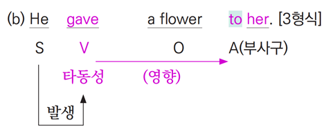 ►(b)문장을 보면 her는 He가 실행한 gave의 영향을 받았는지는 알 수가 없다. 다만 a flower는 her를 향해서(to her) 수여되었다(gave)라는 의미만 알 수 있을 뿐이다. a flower와 her 사이에는 to라는 공간적 거리가 존재한다. 이것은 to가 의미하는 공간적 거리로 인하여 her가 a flower를 수여 받았는지의 여부는 전체적인 맥락으로 판단할 수밖에 없다는 것을 의미한다.