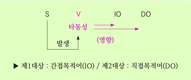타동사에는 목적어를 1개 갖는 완전타동사(3형식)와 목적어를 2개 갖는 수여동사(4형식)가 있다.