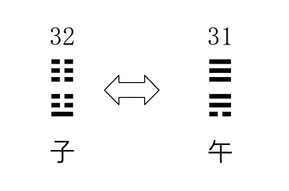 12월괘(12벽괘)를 보면 자(子)는 지뢰복이 되고, 오(午)는 천풍구가 된다. 2진법으로 산정된 양효의 수리가 子는 32가 되고 午는 31이 되며, 이를 합하면 63으로서 하나의 원(태극)을 이룬다(양효로 구성된 중천건괘의 수리가 63이다).