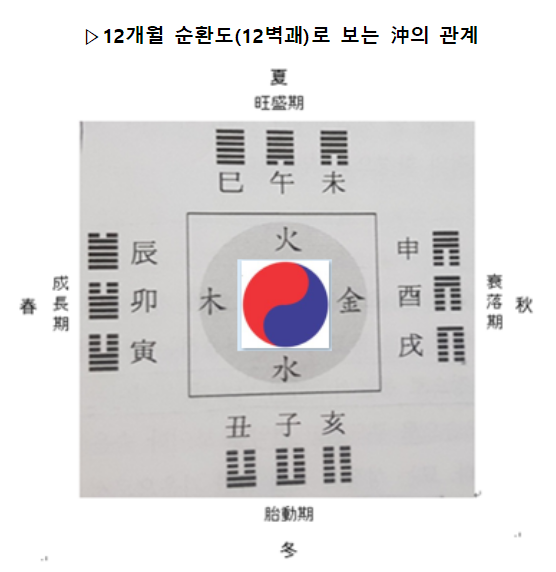 사시순환과 12벽괘12 벽괘를 보면 충은 반대인 배합괘끼리의 충을 의미한다. 반대 괘로서 서로 충하면서도 합을 추구함으로써 상호 보완관계가 되어 순수 기운인 건乾(☰☰)과 곤坤(☷☷)을 이루며 태극을 와성한다. 수리적으로도 서로의 수를 합하면 63으로 태극이 된다.