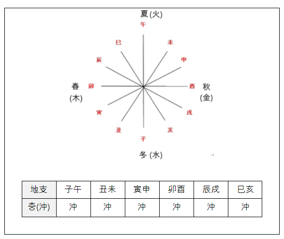 인신사해(寅申巳亥)는 인신사해끼리, 진술축미(辰戌丑未)는 진술축미끼리, 자오묘유(子午卯酉)는 자오묘유끼리 서로 극하는 관계이다. 양은 양과 부딪히고, 음은 음과 부딪힌다. 즉, 寅卯辰 東方木局과 申酉戌 西方金局(金木沖), 巳酉未 南方火局과 亥子丑 北方水局(水火沖) 간의 상충(相沖)을 의미한다. 계절적으로는 [春-秋, 夏-冬] 간의 충이며, 기후로는 [한(寒)-난(暖), 조(燥)-습(濕)] 간의 충이 된다.