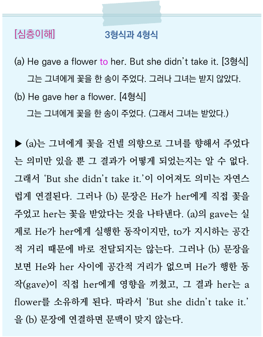 ►He와 her사이에는 공간적 거리(to)가 있다. 그는 꽃 한 송이를 그녀를 목적지로, 그녀를 향해서 주었다는 의미이다. her는 꽃을 받았을 수도 있고 받지 않았을 수도 있다. 당연히 꽃을 받아서 소유하고 있음을 의미하는 4 형식 문형(He gave her a flower.)과는 느낌이 다른 표현이다.