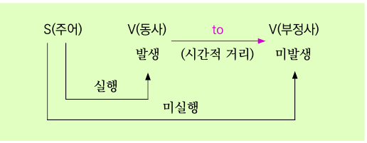 S와 V사이에 to가 놓여 방향성이 있는 시간적 거리를 표시하고 있다. to는 V라는 동작을 실행시킬 목적으로 지시하는 일종의 방향성을 표시하는 화살표이다. S는 V라는 동작을 실행함에 있어 지금 당장은 발생시킬 수가 없다. 즉, V는 to가 지시하는 어느 정도의 시간이 경과되어야 비로소 발생되는 동작이다. 그러므로 본동사의 시점을 기준으로 할 때 to-V는 아직 화자의 생각 속에 있는 ‘미발생’ 동작을 의미한다.
