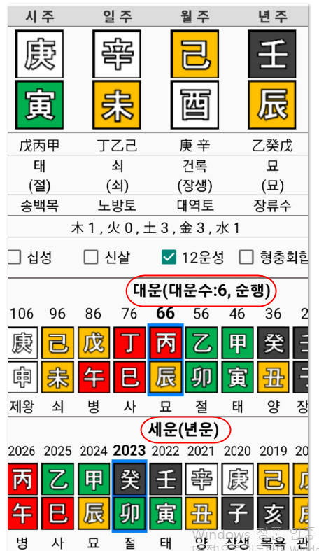 사주팔자를 다루는 명리학에서 일반적으로 '대운이 들어왔다'라는 표현은 어떤 큰 행운이 들어왔다는 의미가 아니라 단지 10년 단위로 산정되는 류운(流運)의 전환점이 도래했다는 뜻이죠. 세운은 1년 단위의 변화를 분석하고, 대운은 10년 단위로 삶의 큰 흐름을 분석하고 예측합니다.