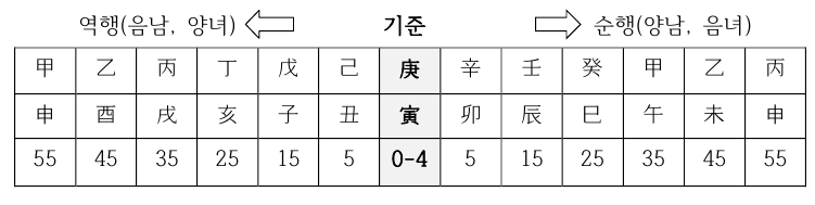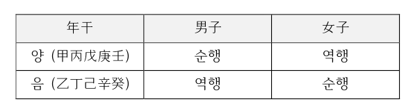 -월주(月柱)를 기점으로, 연간(年干)이 음(陰)이면 60 갑자가 男命은 역행하고, 女命은 순행한다.