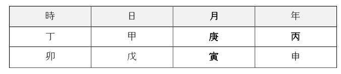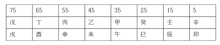 丙申년에 태어난 남자의 사주는 천간이 양(陽)인 丙火이다. 그러므로 남자사주의 대운은 월주 庚寅에서부터 60 갑자를 순행하여 구한다.
