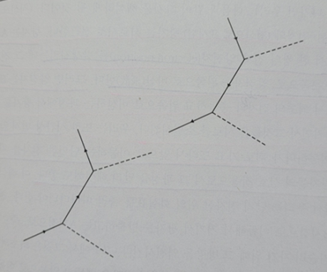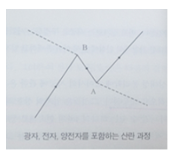 관례적으로 아래에서 위로 이 도표를 읽어 나가면 우리는 다음과 같이 그것을 해석하게 될 것이다. (직선으로 표시된) 전자와 (점선으로 표시된) 광자는 서로서로 접근한다. 광자는 A지점에서 오른쪽으로 양전자는 왼쪽으로 비산(飛散)한다. 그러면 양전자는 B지점에서 최초의 전자와 충돌하고 왼쪽으로 비산하는 과정에서 광자를 발생시키면서 그것들은 서로를 소멸시킨다. 우리는 또한 시간상 먼저 앞으로 이동하다가 뒤로 가고 또다시 앞으로 이동하는 단일한 전자를 지닌 두 광자들의 상호작용으로서 그 과정을 달리 해석해도 좋다. (……) 왜냐하면 모든 입자들은 그것들이 공간상 왼쪽으로든 오른쪽으로든 이동할 수 있는 것과 같이 시간상 전후로 이동할 수 있기 때문이며, 따라서 도표에서 시간의 일방통로를 부여하는 것은 아무런 의미도 갖지 못한다.