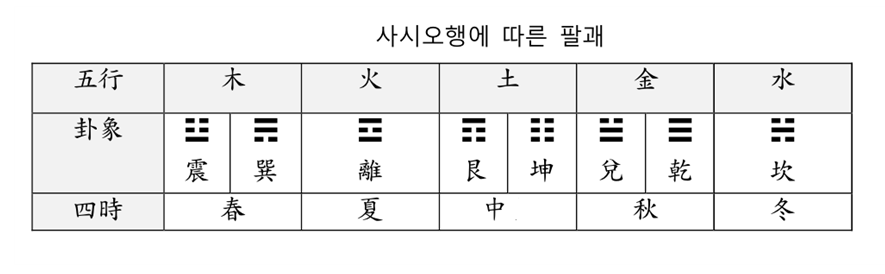 「사시오행과 문왕팔괘도의 상관관계」를 도표로 정리하면 위와 같이 됩니다.