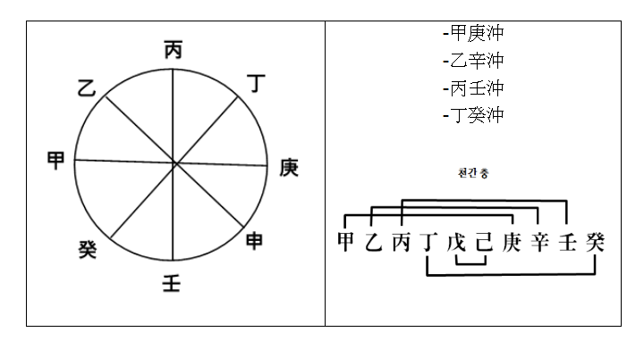 천간 충은 서로 상반되는 오행의 기운끼리의 부딪히는 것을 말한다. 양은 양끼리, 음은 음끼리 충돌한다. 생장하는 木氣(甲乙)와 수렴하는 金氣(庚辛)가 서로 대립하고 충돌한다(金木相沖). 분열 확산하는 火氣(丙丁)와 응축 저장하는 水氣(壬癸)가 서로 대립하고 충돌한다(水火相沖). 충은 음양이 조화되지 않고 서로 대립하여 기질이 상충되는 오행끼리 정면으로 충돌함으로써 변화를 일으킨다. 합은 음과 양이 합하여 만물을 낳는 부부의 도를 상징하나, 충은 편음(偏陰) 편양(偏陽)이 만나 음양의 부조화를 이루니 상극보다 더 큰 기세의 변화를 일으킨다.