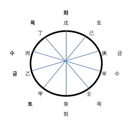 오행은 목기(木氣)가 주체가 되는 자연법칙이며, 오운은 토기(土氣)가 주체가 되어 갑기토운(甲己土運)을 머리로 삼아 [土-金-水-木-火]로 상생(相生) 순환하는 원리이다. 천간 甲木이 여섯 번째 천간인 己土와 합을 하여 戊土 오행으로 바뀌게 된다.