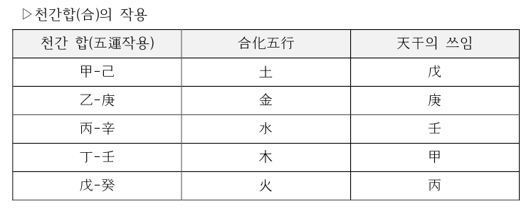 천간합은 천간 오운도(五運圖)에서 비롯된다. 오운(五運)은 천도를 운행하는 오행이 인체 내에서 작용하면서 새롭게 생성하는 오행의 기운이다(황제내경). 오행은 수(水)에서 시작하고, 만물은 토(土)로부터 생하며, 水火木金 또한 土를 바탕으로 시작하니 오운의 시작은 土가 된다.