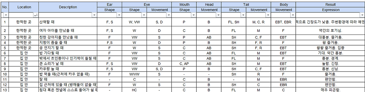Tail(Movement) - M: 움직임 없음; C: 원을 그리며 움직임; S: 천천히 쓸듯이 넓게 움직임; F: 짧게 빨리 흔들림; R: 꼬리 끝만 흔들림
