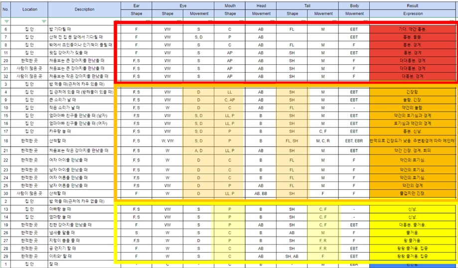 Mouth(Shape) - C: 완전 닫음; LL: 입술 햝음; AP: 경계 혹은 항복(몸의 움직임으로 판단); FG: 입 크게 으르렁; P: 혀 빠짐; Y: 하울링 자세