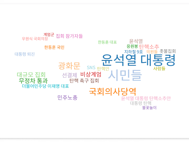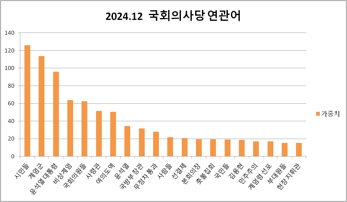 계엄 시국 ‘국회의사당’과 가장 연관된 단어는 놀랍게도 ‘시민들’이 나왔다. ‘사람들’, ‘국민들’도 비슷한 맥락의 연관어로 보인다. 국회 기능을 마비시키려 한 ‘계엄군’, ‘윤석열 대통령’, ‘비상계엄’보다 ‘국회의사당’과 연관성이 큰 것으로 나타났다. 계엄을 해제하고 탄핵 소추안을 의결한 ‘국회의원들’은 다섯 번째였다.