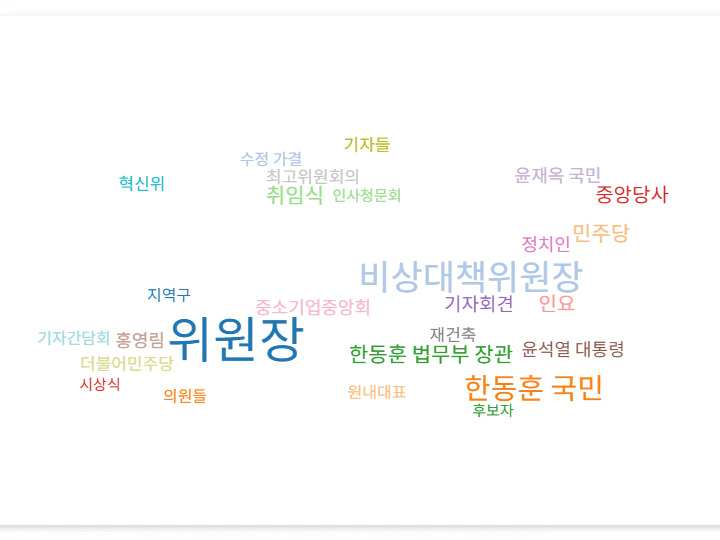 2024년 12월을 분석하기에 앞서 2023년 12월 한 달간 전국 일간지, 방송사가 생산한 기사에서 ‘여의도’를 키워드로 연관어를 살펴봤다. 앞 글에서 상술한 것처럼 여의도는 계절별로 주기적인 일정이 있는 곳이어서, 변화를 비교하려면 전년 동월이 적절하다. 빅카인즈의 연관어 분석 알고리즘은 빈도보다는 키워드와의 상호작용에 가중치를 부여한 단어들을 보여준다.