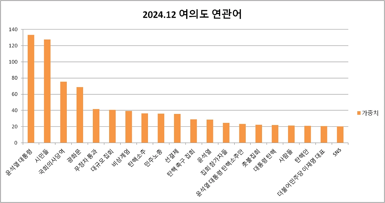 2024년 12월 3일 윤석열 대통령의 비상계엄 선언은 ‘여의도’의 연관어를 모두 바꿔놓았다. 12월 한 달간 ‘여의도’와 가장 연관성이 큰 단어는 ‘윤석열 대통령’으로 나타났다. 이어진 단어들은 모두 윤 대통령과 대립하는 단어들이다. ‘시민들’은 ‘국회의사당역’과 ‘광화문’에서 ‘대규모 집회’를 열어 ‘비상계엄’에 반대하고 ‘탄핵 소추’를 요구했다. ‘무정차통과’는 인파의 규모를, ‘민주노총’은 집회 주최 측을, ‘선결제’는 집회 참여자들을 후원하는 새로운 집회 문화를 뜻한다. 모두 여의도가 계엄 시국의 진원지임을 보여준다.