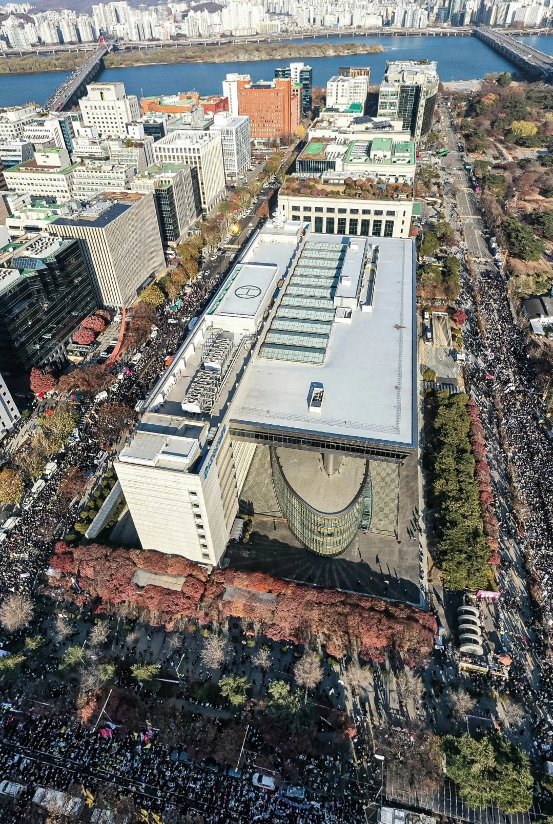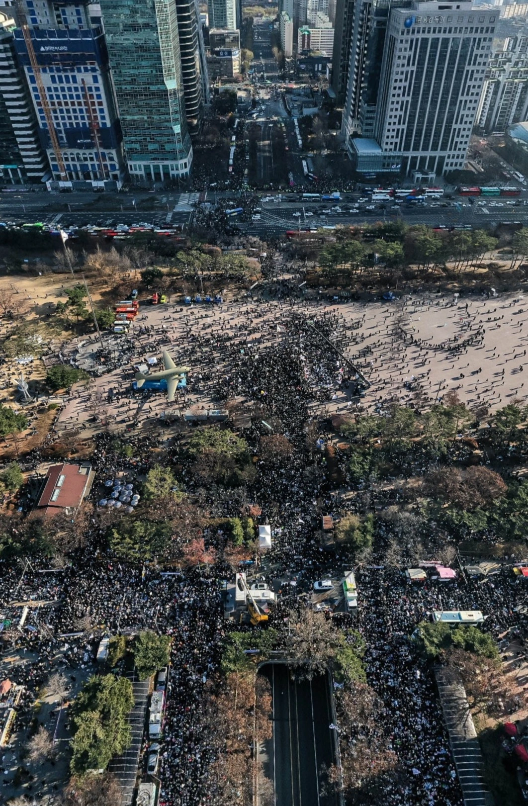 게다가 국회 앞에는 시민들이 모일 공공 공간이 없다. 산업은행 앞 인도가 넓은 편이라 집회 장소로 쓰이지만 그곳은 광장이 아니다. 경찰은 대규모 집회가 열리면 대신 10차로, 너비 100미터인 의사당대로의 차량 통행을 통제해 집회 장소로 관리한다. 그런데 의사당대로의 중앙에는 교통섬이 있고, 키 큰 소나무들이 자리 잡고 있다. 대로의 절반은 여의도 공원 방향으로 가면서 지하차도로 연결된다. 집회 때 통신사의 이동기지국 역할을 하는 대형 버스까지 도로 곳곳에 놓이면 아스팔트 도로 위에선 주최 측의 무대가 잘 보이지 않는다.