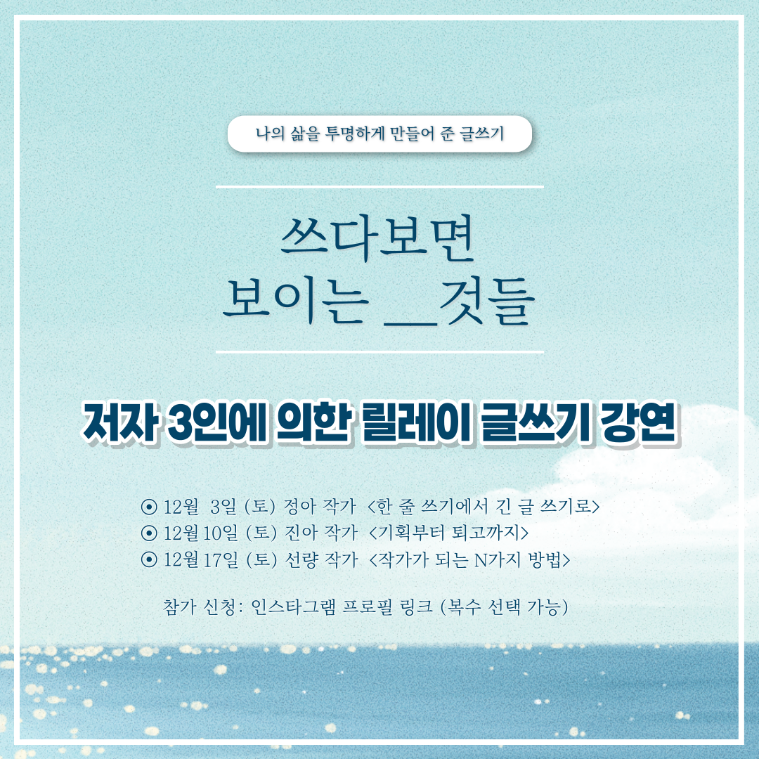 <쓰다 보면 보이는 것들(부제: 나의 삶을 투명하게 만들어 준 글쓰기)>은 평범했던 우리가 글쓰기를 만나 눈뜨게 된 나와 주변, 그리고 새로운 길에 관한 이야기입니다. 첫 책으로 글쓰기 책을 낸 무모함은 브런치와 인스타그램을 오가며 엮인 인연인 진아 작가님과 선량 작가님이 함께라서 가능할 일이었습니다.