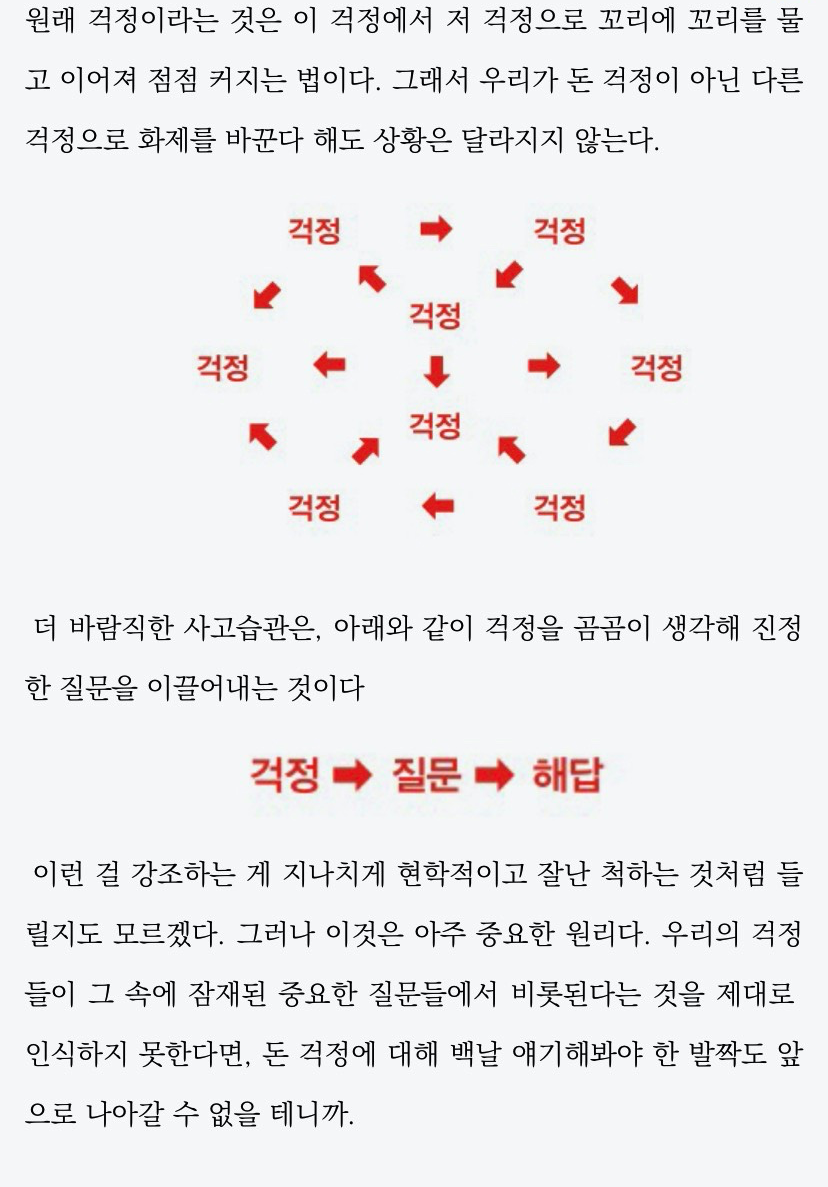 ‘돈 걱정’ 속에는 다음과 같은 질문들이 숨어 있다. 이 잠재된 질문들에 명확히 답할 수 없기 때문에 자꾸 걱정이 생겨나는 것이다.