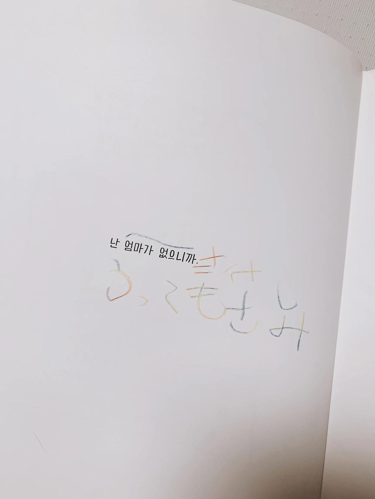 라고 또박또박 적혀있는 페이지를 보았을 때 적잖이 충격을 먹은 듯했다. 그 흔적으로 삐뚤빼뚤한 글씨로 「とても さみしかった。かわいそう」(너무 슬프다. 불쌍해)라고 적었던 것을 기억한다. 태어나서 눈을 뜬 그 순간부터 당연하게 내 옆에 있어 준 엄마의 존재. 그런 아이에게 '엄마가 없을 수도 있구나', '엄마가 없는 아이도 있구나'라는 사실을 처음으로 알려준 책이었다.