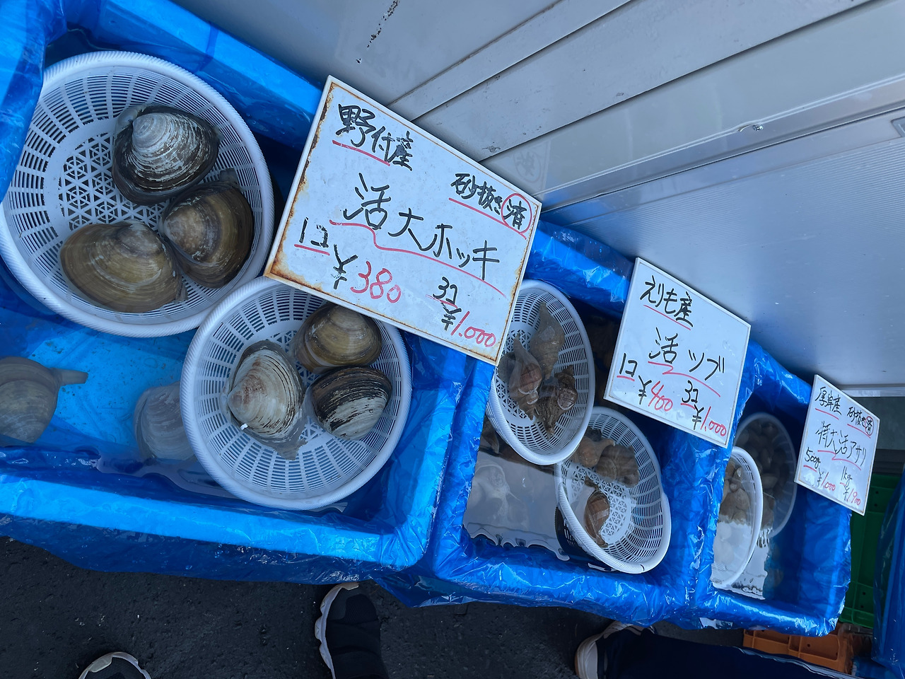 아침 일찍 출발해서 가는 길 중간중간 朝市(아사이치, 아침에 열리는 시장)에 들러 신선한 해산물을 샀다.