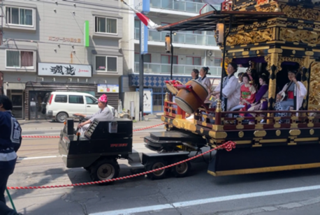전통 복장을 한 1000여 명의 시민이 홋카이도 신궁의 신을 얹은 4개의 가마를 중심으로 8개의 신차와 함께 거리를 걷는다.