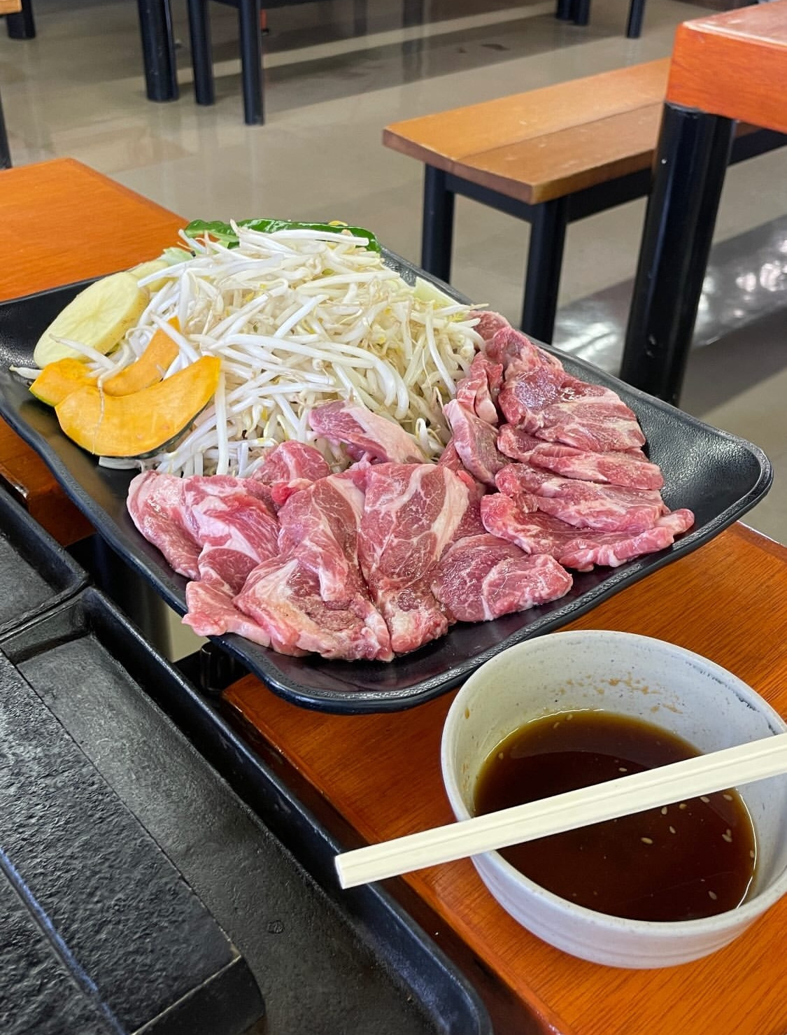 공원 안의 식당에서 ‘여기서 키우는 양이 아닙니다’라고 하는 징기스칸 요리를 먹었다.