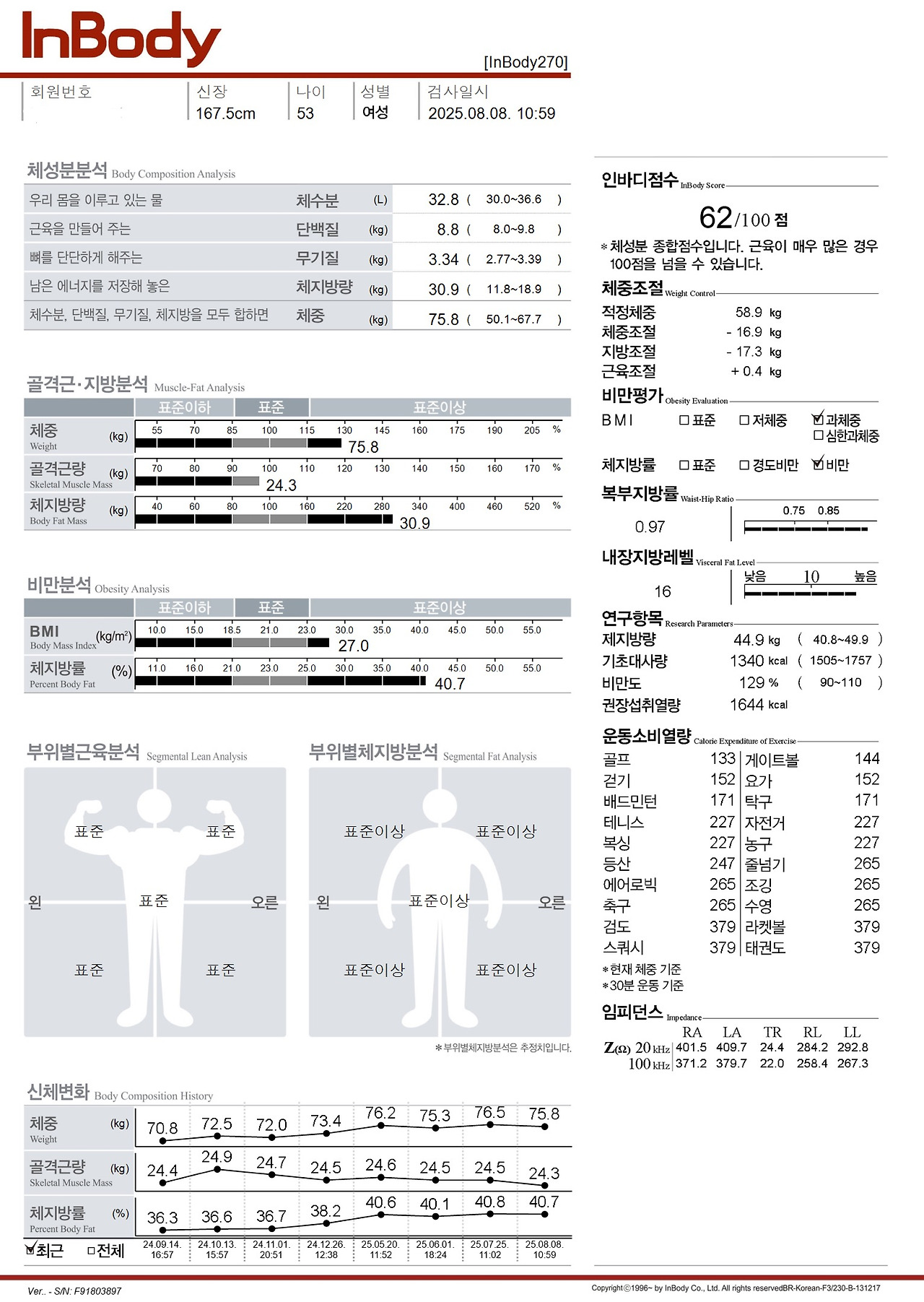 그래서인지... 2주 동안 주 3회 필라테스와 주 5회 헬스클럽에 갔음에도 - 운동량과 질은 나도 장담 못하지만 - 2주 만에 잰 인바디가 정말로 진짜로 1도 변화가 없다.