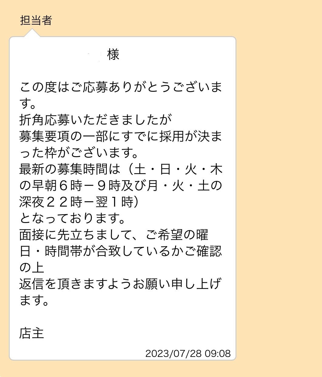 아쉽게도 이미 사람이 채용되어 새벽과 심야시간에만 자리가 비어있는데 그래도 응모하겠느냐는 메일이었다.