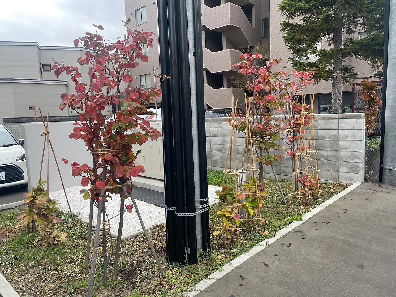 오늘도 동네 중고샵을 돌아보고 오는데 집집마다 정원수에 막대기를 묶어놨더라.