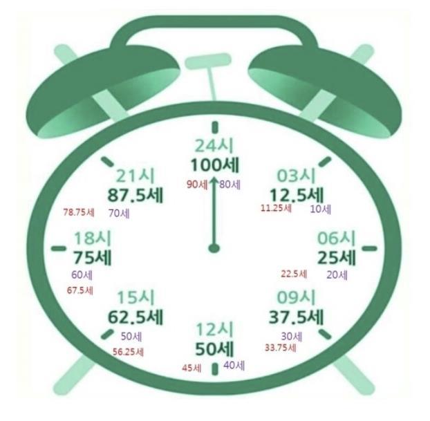 수년 전 김난도 교수의 <아프니까 청춘이다> 책에서 인생을 80세로 보았을 때 이를 하루 24시간으로 표현하면 1년이 18분이라고 계산한 적이 있었다. 하지만 지금은 기대수명이 90세를 넘어 100세를 바라보는 시대가 되었으니 이제는 인생시계를 새롭게 적용해 볼 수 있다.