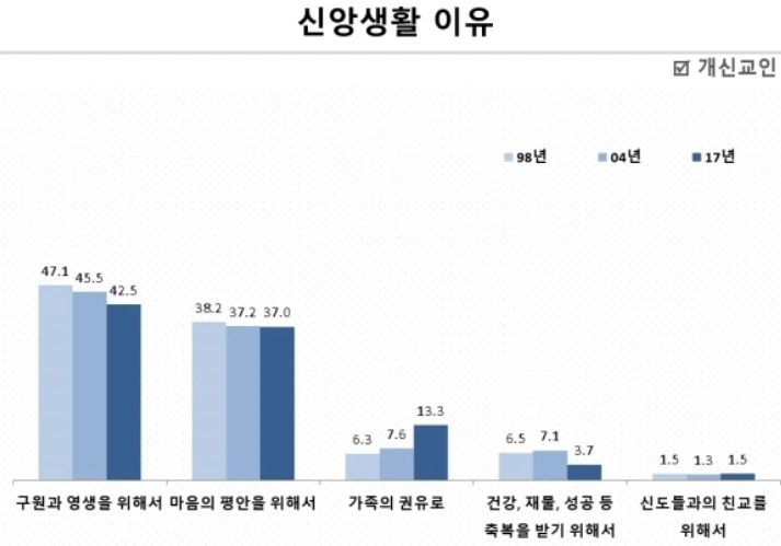 한 기독교 단체에서 교회 다니는 이유에 대해 비슷한 항목으로 설문조사를 한 결과가 있었어. 구원/영생, 마음의 평안이 가장 큰 이유로 나타났지. 하지만 사람들이 어느 한 가지 이유만으로 교회를 다니지는 않을거야. 위에 언급한 다섯 가지 모두 해당되는 사람도 있고, 어릴 때부터 습관처럼 다니는 사람도 있겠지.