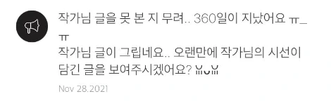 얼마 전부터 브런치 앱에서 이런 알람이 오기 시작했다. 240일이 지난 시점부터 알람이 오더니… 30일마다 알림이.