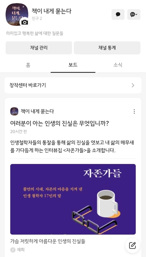 밥벌이에 대한 고민과 방황 속에서 일 년이나 글을 쓰지 못했다. 방황은 여전하지만, 역시 다시 글을 쓰고 싶다는 마음에 슬쩍 돌아왔다. 그런데 '카카오톡 채널 연결하기'라는 못 보던 기능이 눈에 띄었다. 카카오뷰 창작채널을 개설해서 브런치와 연동하는 서비스란다.