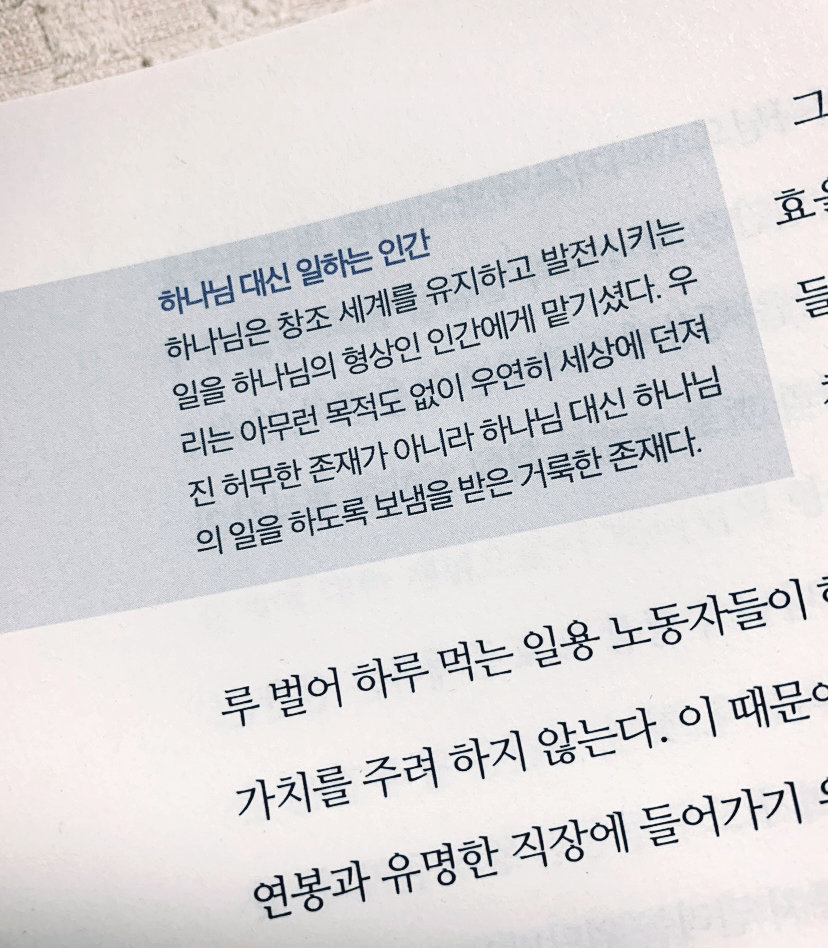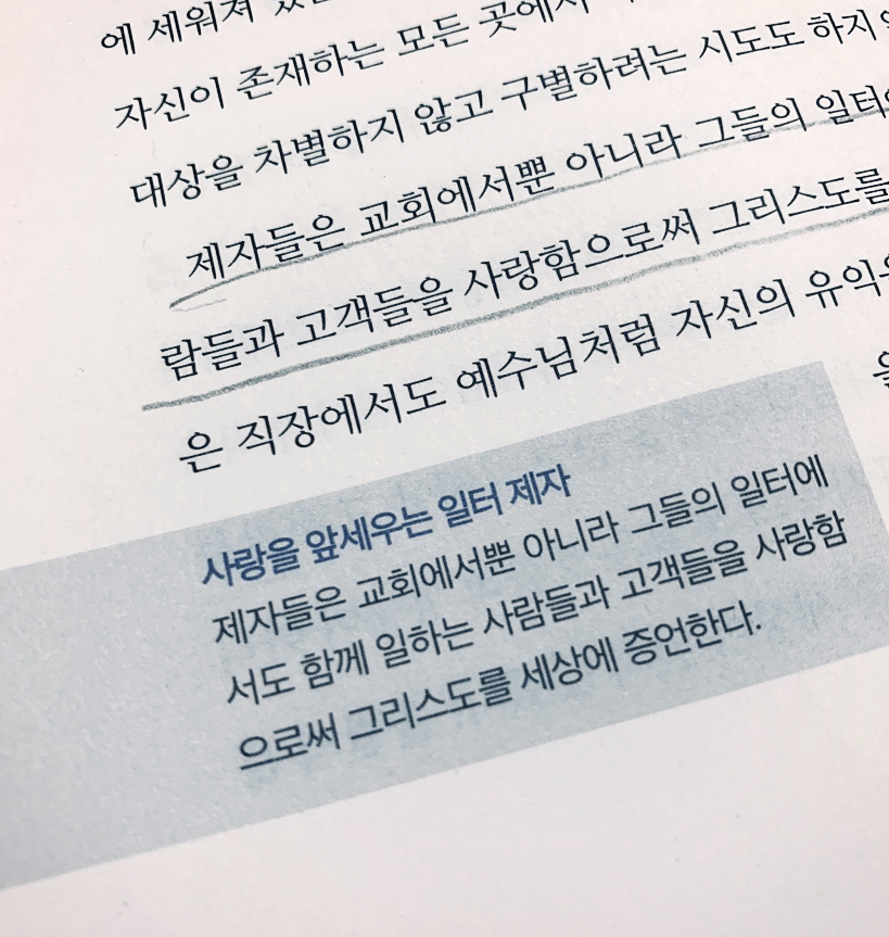 어렵고 힘든 일이다. 이기적이며 악한 본성이 여전히 내 마음에 가득하기 때문이다. 그렇지만 다시 도전해보려고 한다. 저자의 말처럼 내 삶의 궤적이 하나님이 주신 소명을 따라갈 수 있다면 좋겠다. 그리스도인으로서 나의 일터에서 ‘세상과 다른 삶’, ‘사랑하는 삶’을 살아보고 싶다.