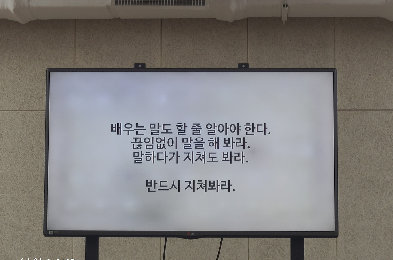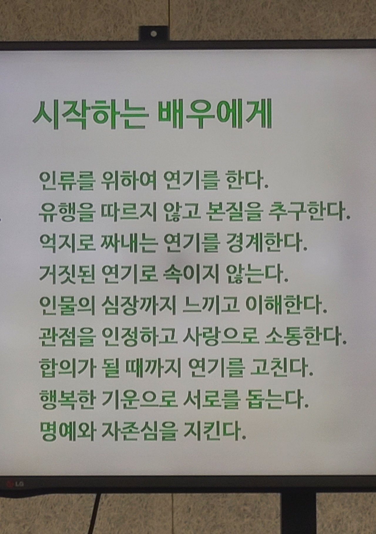 연극이 단순 오락거리가 아니고, 소통의 도구, 진실된 예술이라는 것..쉽게 함부로 할 수 있는 일도 아니고, 진지하게 어떤 기준을 가지고 행해져야 하는지 등 배우가 가져야 할 마음가짐에 대해서도 얘기를 듣다보니, 그저 새로운 무언가가 필요해서 잃어버린 나를 찾아보겠다고 시작한 이 도전이 내게 큰 의미가 될거라는 확신이 들었다.