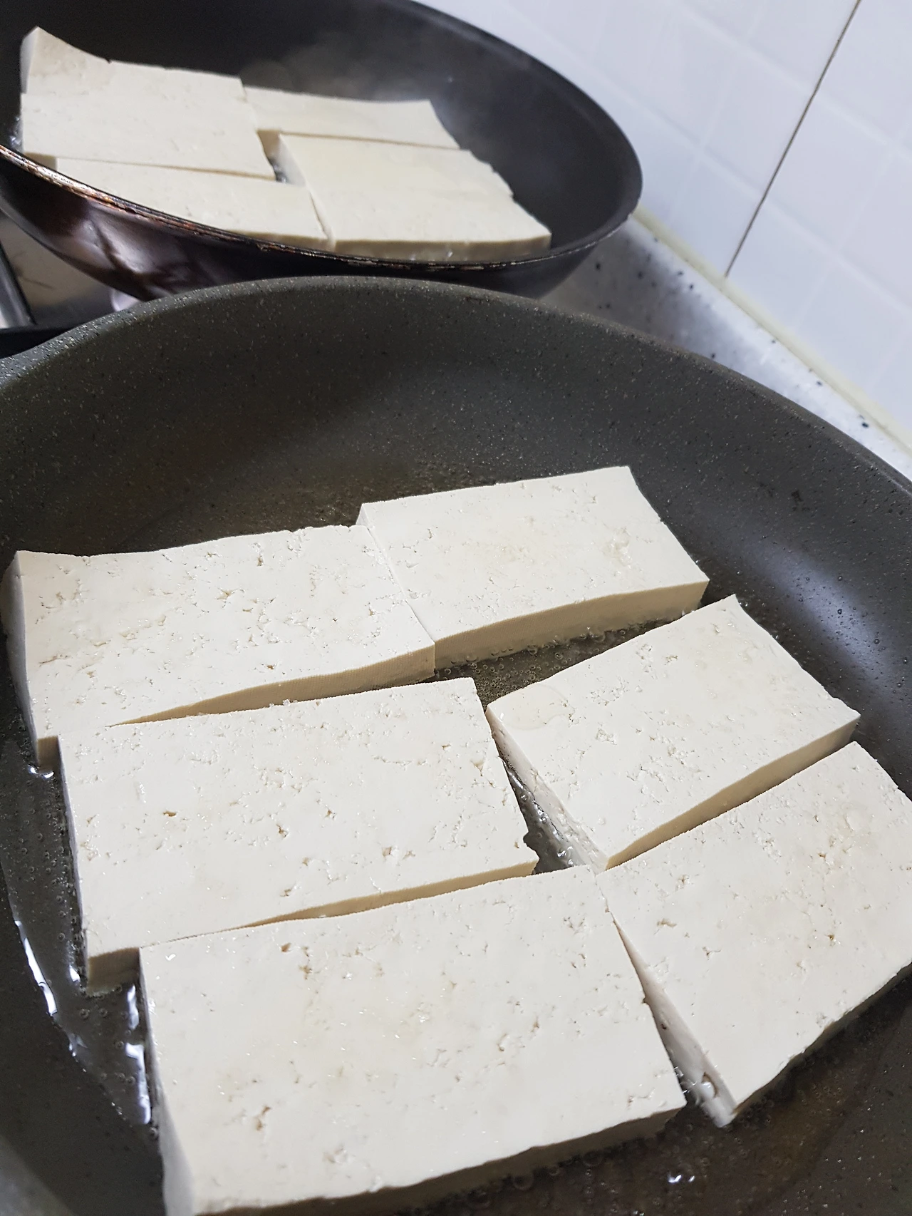 출근 전에 미친 듯이 두부를 지지고 있습니다. 이렇게 지지고도 3/2가 냉장고 속에 있습니다 ㅡ.ㅡ