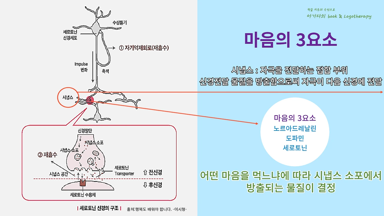 『마음의 3요소, 노르아드레날린, 도파민, 세로토닌의 분비량에 따라 우리의 마음 상태가 결정된다. 뇌 속에는 많은 정보전달물질이 있는데 우리가 일상에서 자주 경험하는 세 가지 물질이 있다. 이 중에 어느 물질이 많이 분비되느냐에 따라 마음의 상태가 결정된다.』