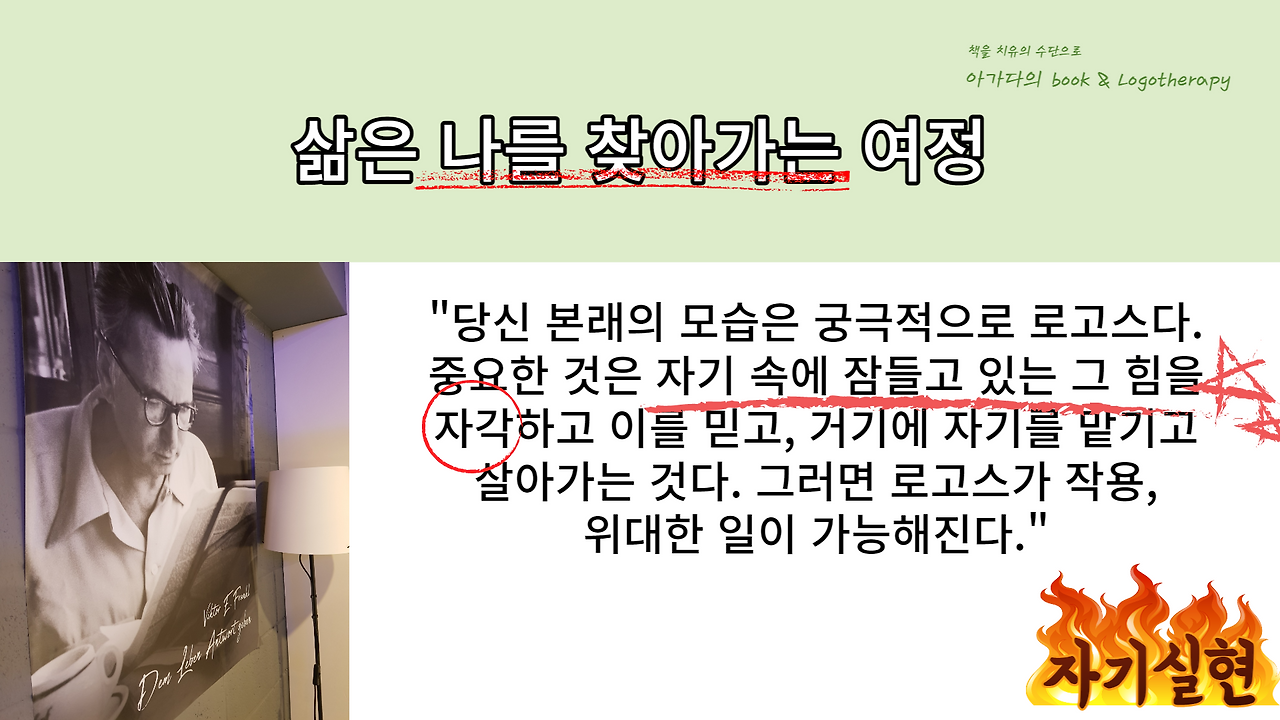 『"당신 본래의 모습은 궁극적으로 로고스다. 중요한 것은 자기 속에 잠들고 있는 그 힘을 자각하고 이를 믿고, 거기에 자기를 맡기고 살아가는 거었다. 그러면 로고스가 작용, 위대한 일이 가능해진다."』(빅터프랭클)