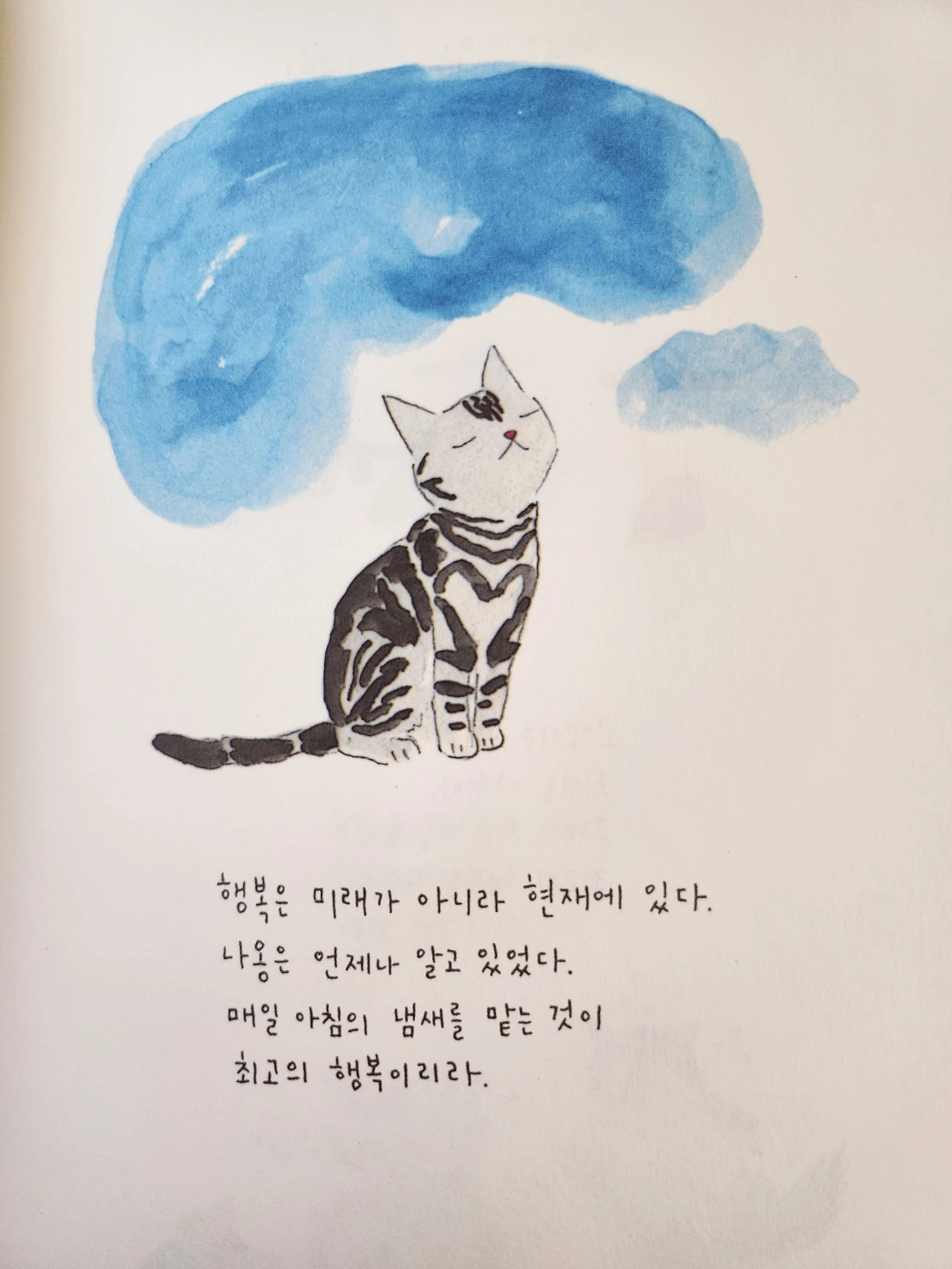 나옹이가 아팠을 때 나옹이가 해가 나면 햇볕 쬐고 눈이 오면 눈도 밟고 바람 불면 바람 느끼고 새가 오면 새도 보면서 살게 해달라고 기도했다. 행복은 미래가 아니라 현재에 있다. 나옹은 언제나 알고 있었다. 매일 아침의 냄새를 맡는 것이 최고의 행복이리라.